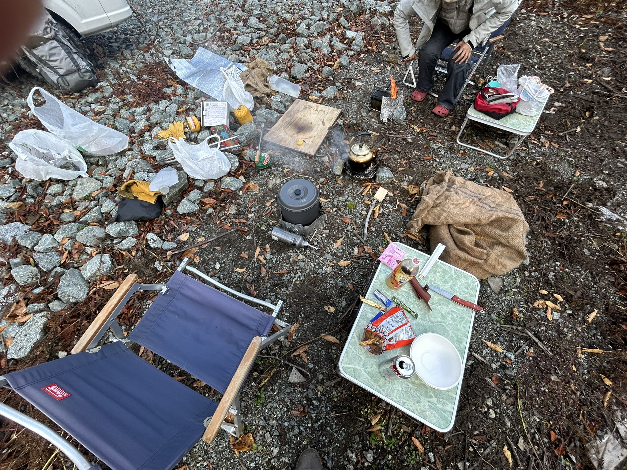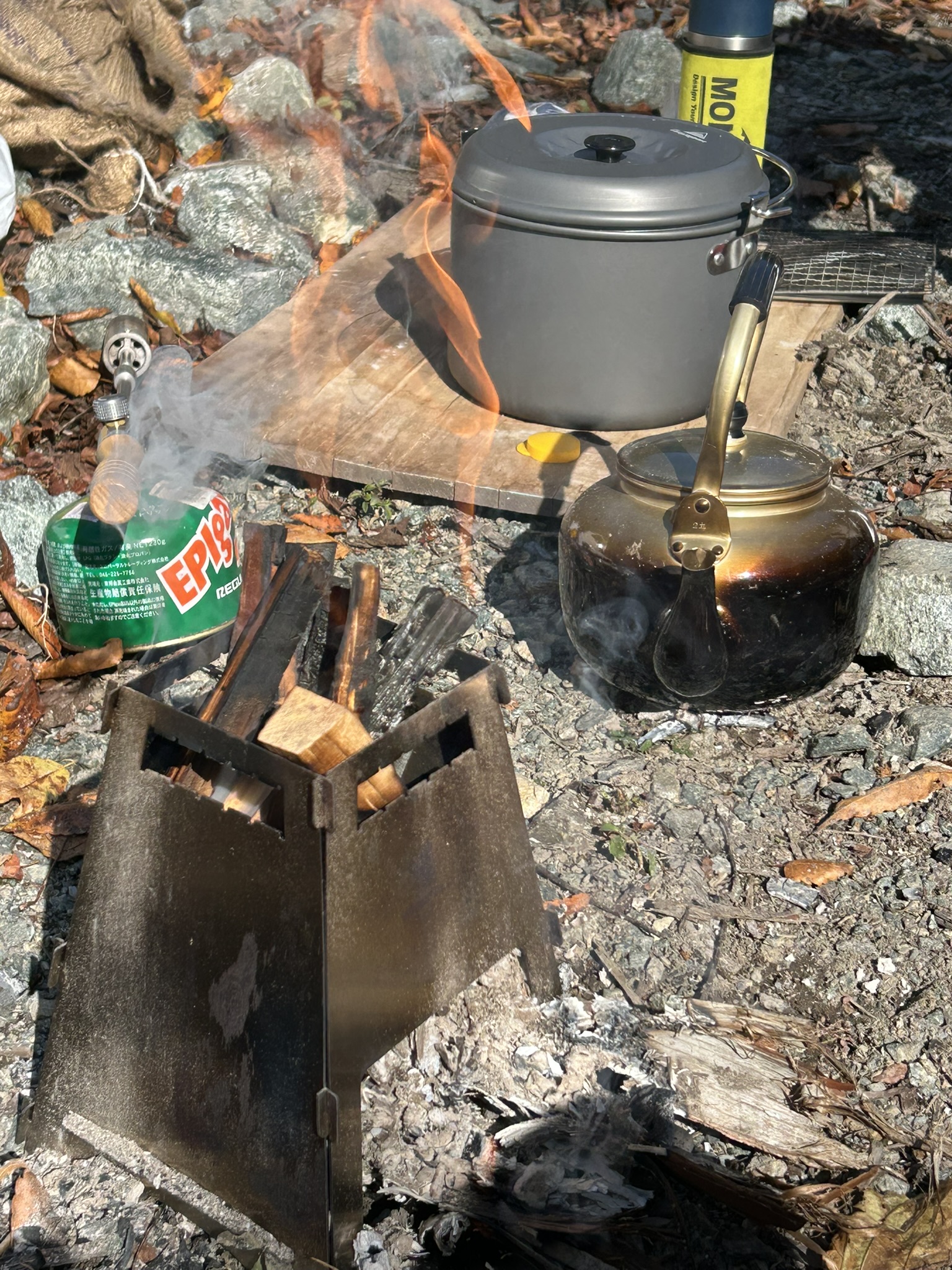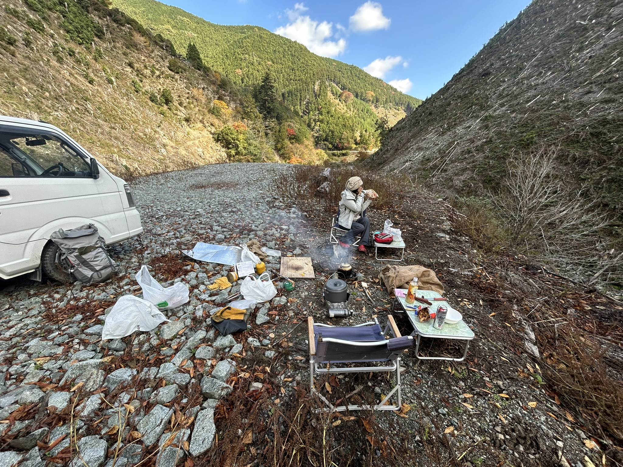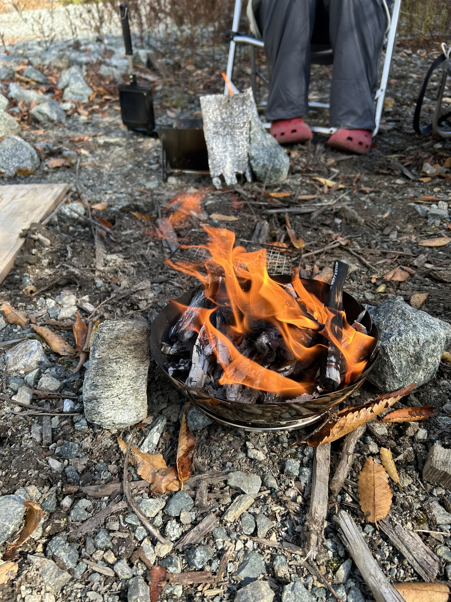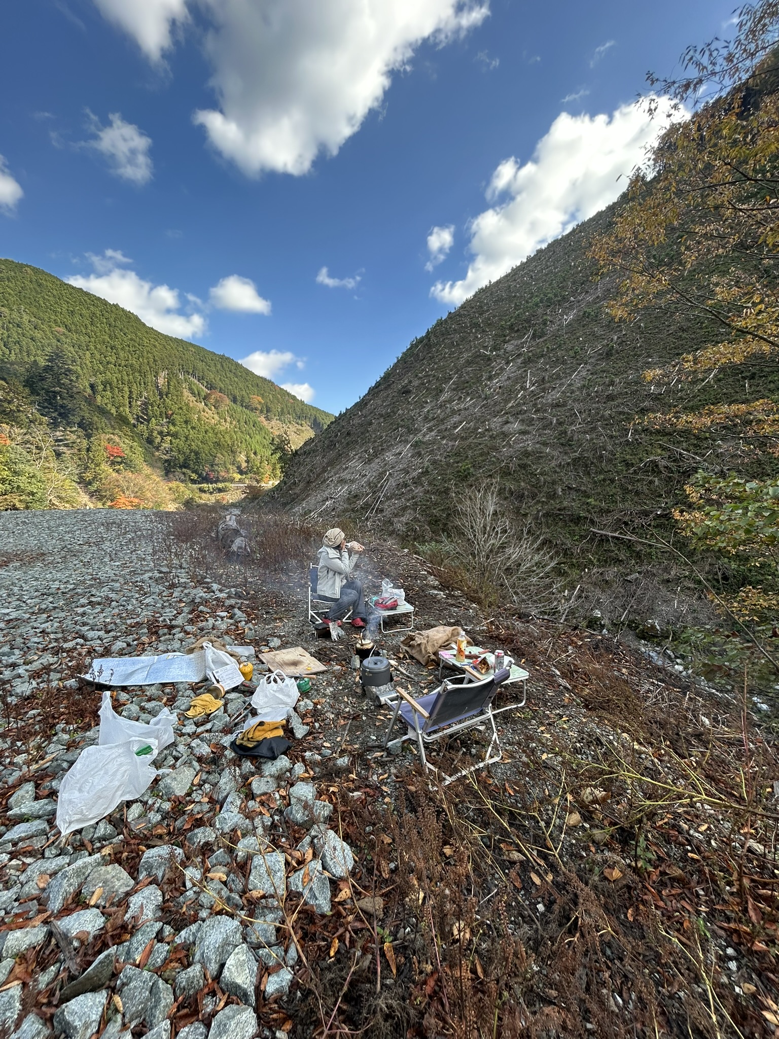 投稿日: 2025年11月16日秋の一日 先日の山行で、下山時にズルズル急坂が怖くて 今回そこにザイルを張る為にでかけた。 しかし、給水所までの所で工事中、道路を直している。 通れそうにないので引き返し、今回は未使用の焚火台、2つをテストして終わり。